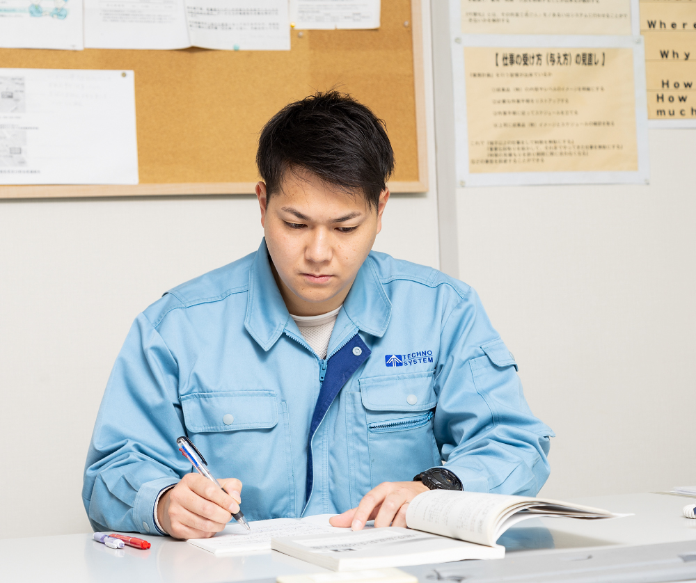 テクノシステムは、未経験でもやる気さえあればしっかりと評価される会社です。私自身、全くの未経験からスタートしましたが、上司や先輩方が丁寧に指導してくださり、資格取得のための支援も受けられる環境が整っています。また、やる気や取り組む姿勢がしっかりと評価され、昇給やボーナスにも反映されるため、モチベーションを保ちながら成長できます。さらに、インフラに関わる仕事は安定しており、将来性もあります。家族との時間も大切にできる働きやすい環境が整っているため、安心して長く働くことができる会社だと思います。